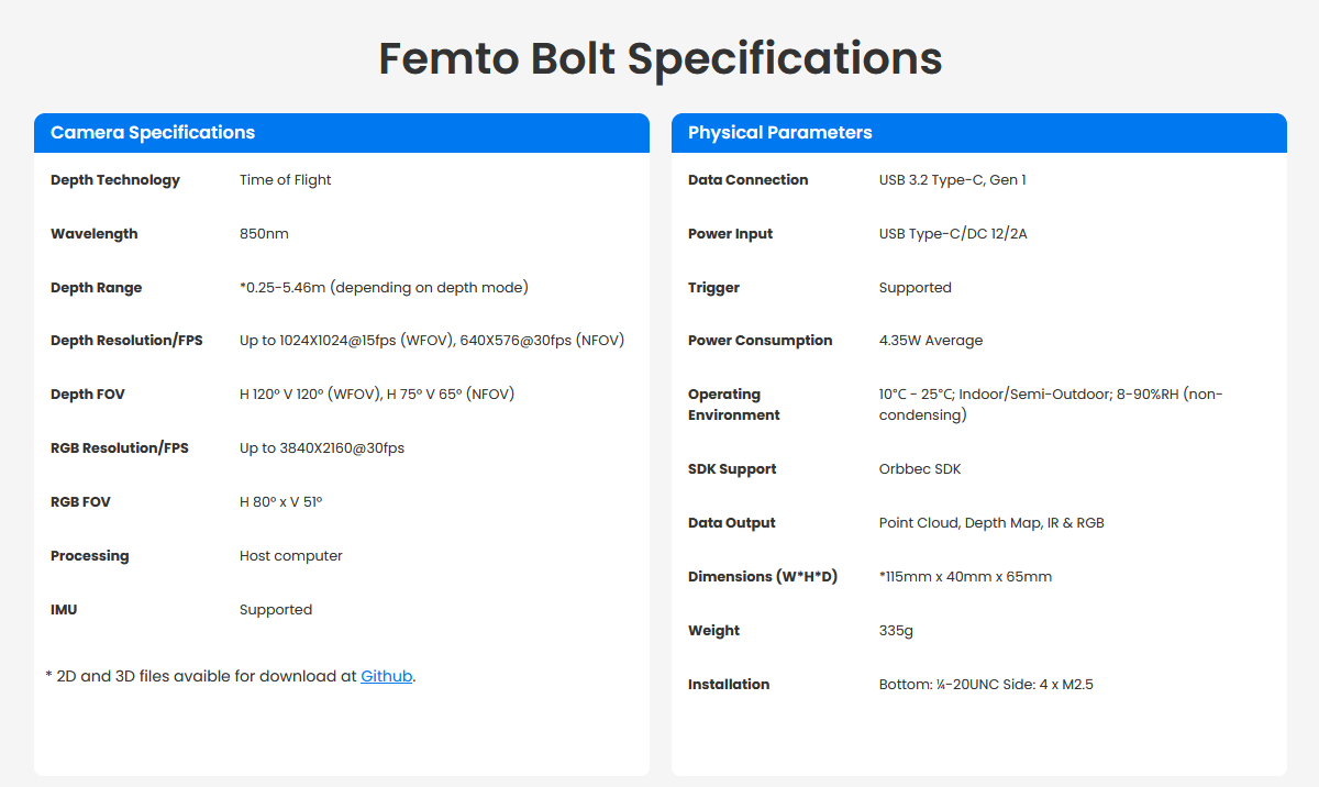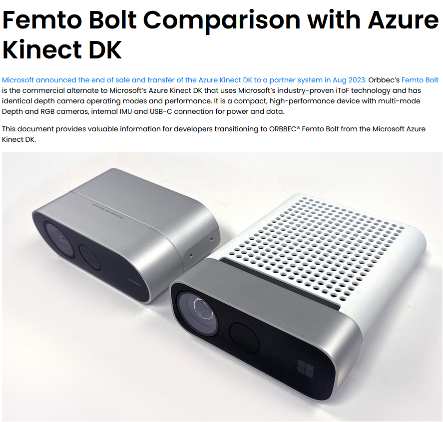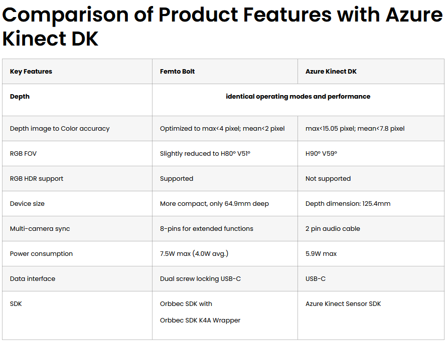 Femto Bolt is a compact, high-performance device with multi-mode Depth and RGB cameras and USB-C connection for power and data. The depth camera uses industry proven ToF technology for Microsoft and has identical operating modes and performance as the Azure Kinect for Microsoft and Orbbec Femto Mega. Its versatility and price makes it attractive for Al-developers for 3D vision applications.