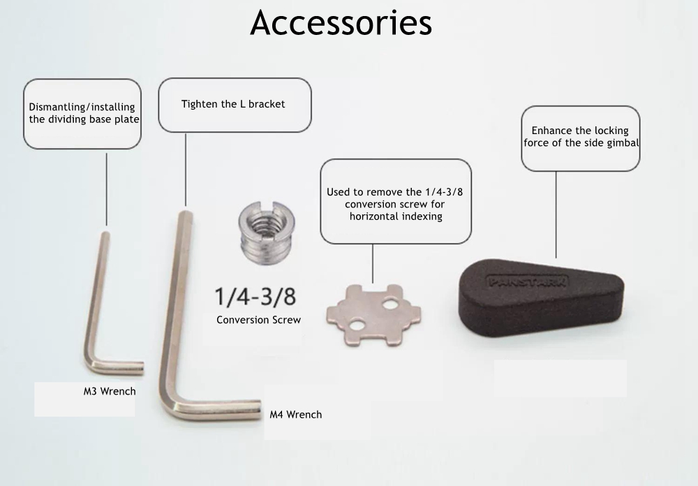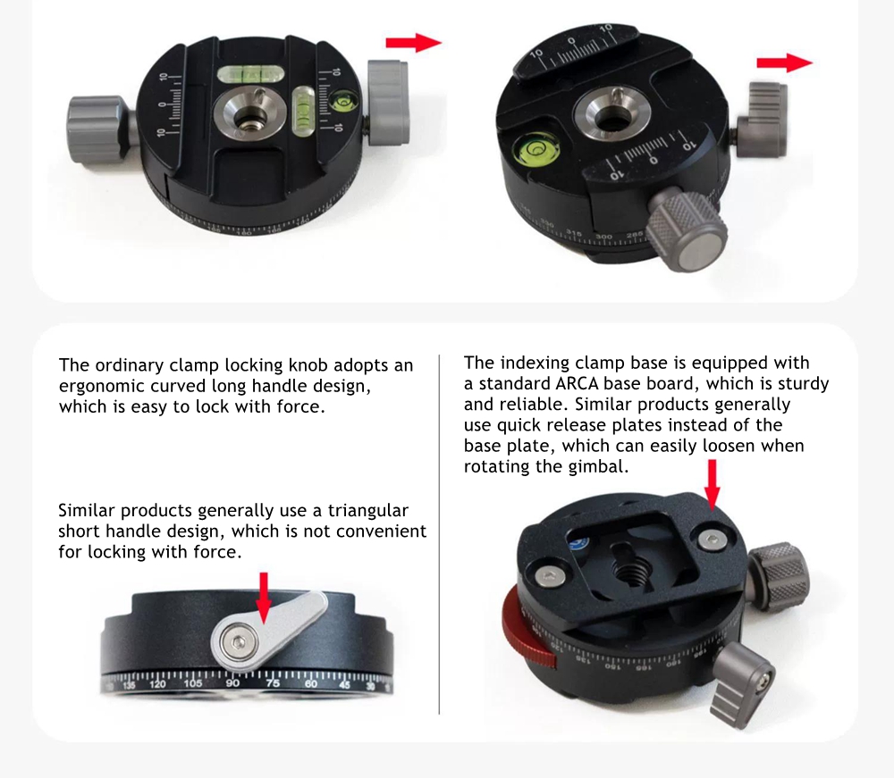 - The locking wrench of the common clamp and the scale division clamp in this splicing gimbal combination can be pulled outward to rotate and adjust the angle, and will not be blocked during locking.