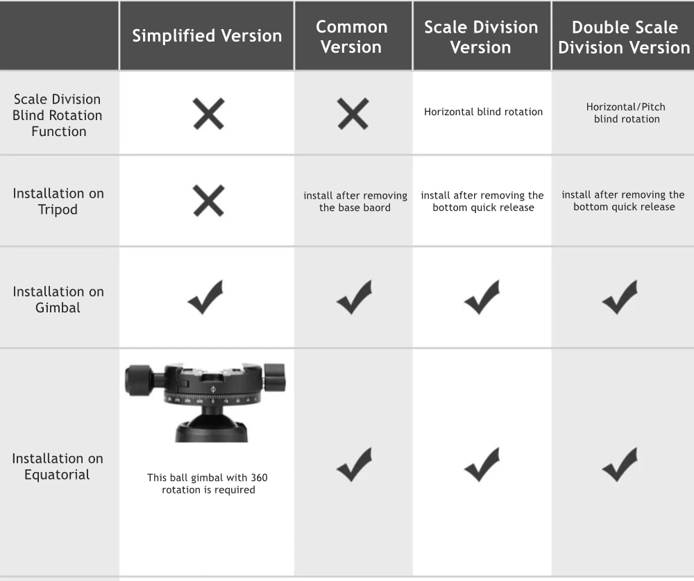 - Regarding the selection of single scale division version and double scale division version: Double scale division version has one more vertical division than single scale division version. If we usually use wide-angle lenses for splicing more, then single scale division version is enough because the number of horizontal rotations is much higher than the number of vertical rotations; If the medium focal length of 35 or above is frequently used for large-scale splicing, the number of vertical rotations will increase. Choosing the double scale division version will further improve the splicing efficiency.