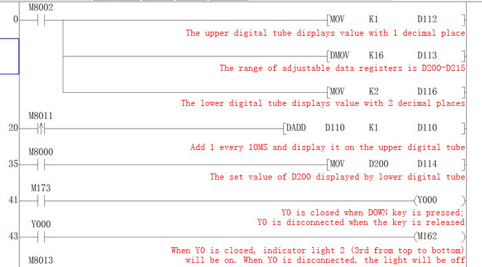 2.In the parameter input mode, the value of the data register D200 and later can be changed. The upper row of digital tubes is used to display the number of the data register to be changed. Press the upper triangle key (increase) or press the triangle key (decrease) to change the number. When changing, the read value will be displayed on the lower row of digital tubes, and the value can also be changed by using the UP key and DOWN key.