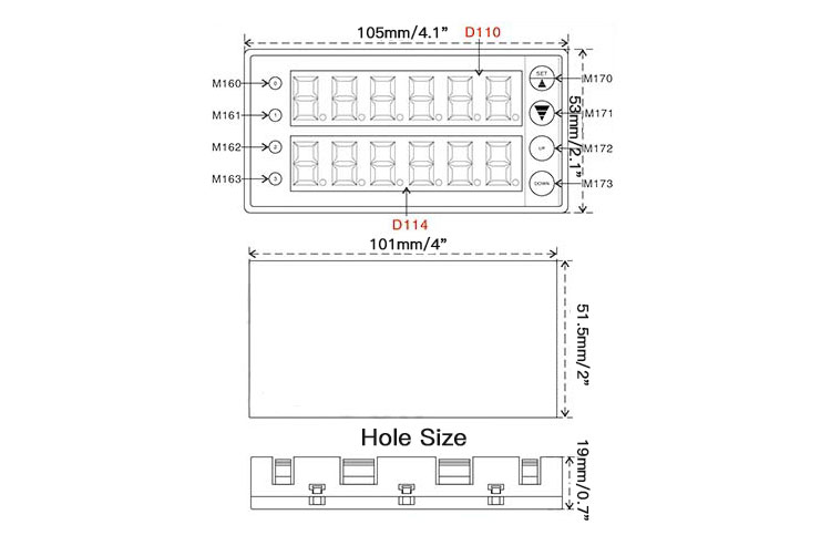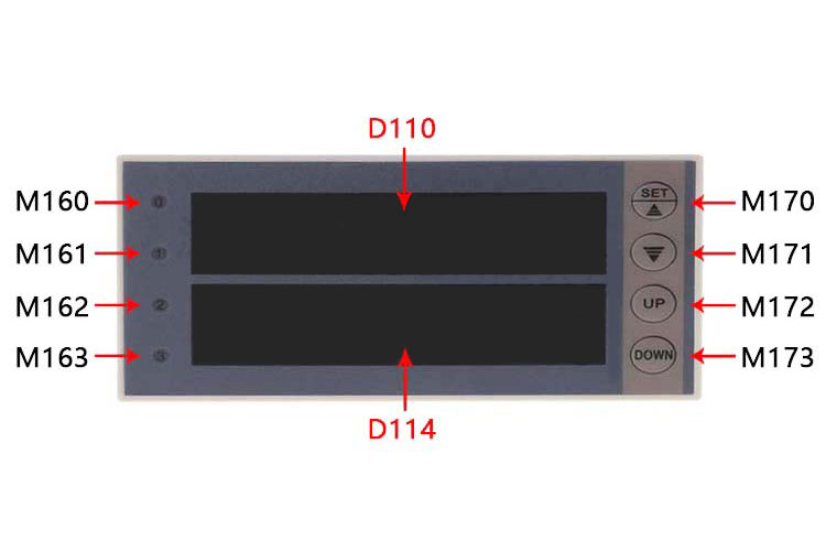 1. Enter the main mode as soon as the power is turned on. In this mode, the upper row of digital tubes displays the value of D110, and the lower row of digital tubes displays the value of D114. The button switch controls the closing and opening of the corresponding intermediate relay (M), and the indicator light is controlled on and off according to the closing and opening of the internal intermediate relay (M). Press and hold the SET key for 3 seconds to enter the parameter input mode.