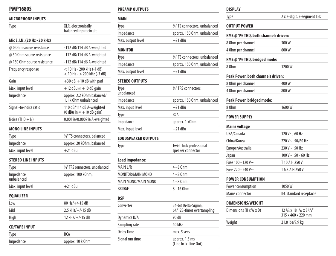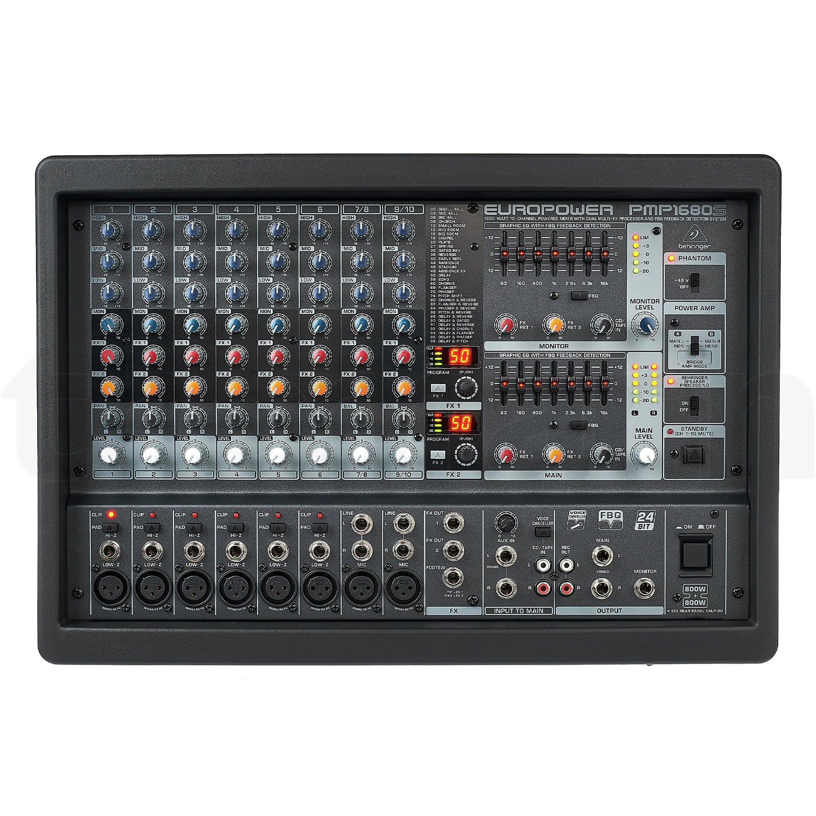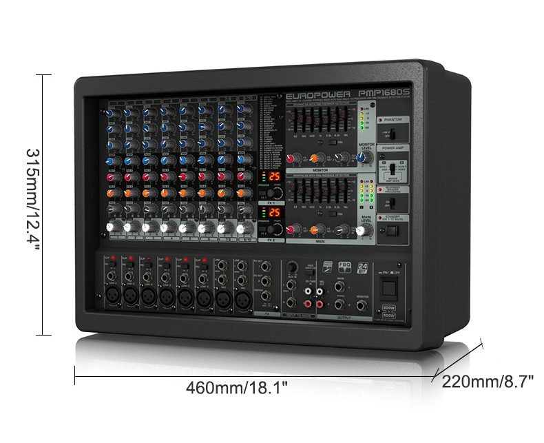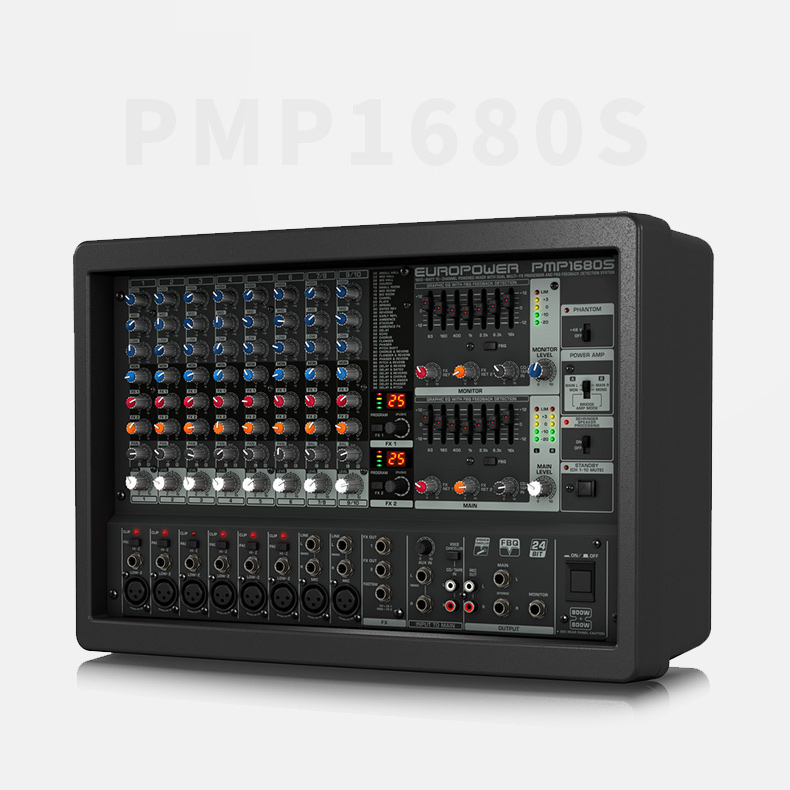 Medium-sized events call for the lightweight PMP1680S (21.8 lbs/9.9 kg), easy-to-use 10-channel, 1600-Watt powered mixer. The PMP1680S is the most efficient and affordable powered mixer for the job, and can even be used as a pure analog mixer - or a pure power amplifier. With its high-quality mic preamps, dual 24-bit Multi-FX processors, and dual 7-band graphic EQs with our FBQ Feedback Detection System - the PMP1680S makes it easier than ever to lend exceptional sound quality to all kinds of public performances.