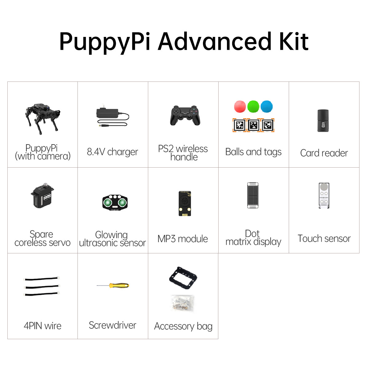 - Made of aluminium alloy and equipped with metal bearings on joints, PuppyPi features light weight and high strength. Compact and flexible body lets it show talents even on the desk.