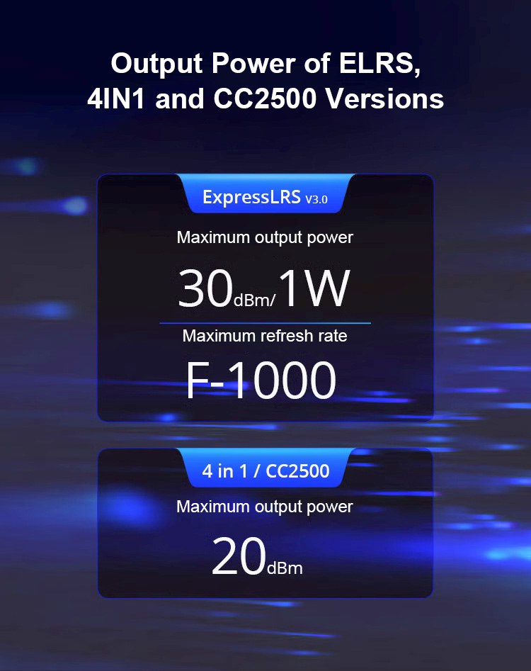 - RF power: CC2500/4-in-1: 20dBm maximum; ELRS: 30dBm maximum