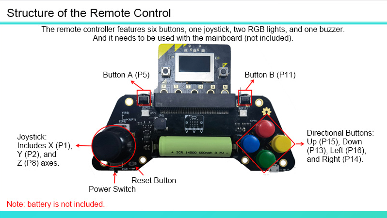 The remote control features six buttons, one joystick, two RGB lights, and one buzzer. And it needs to be used with the mainboard pictured (not included).