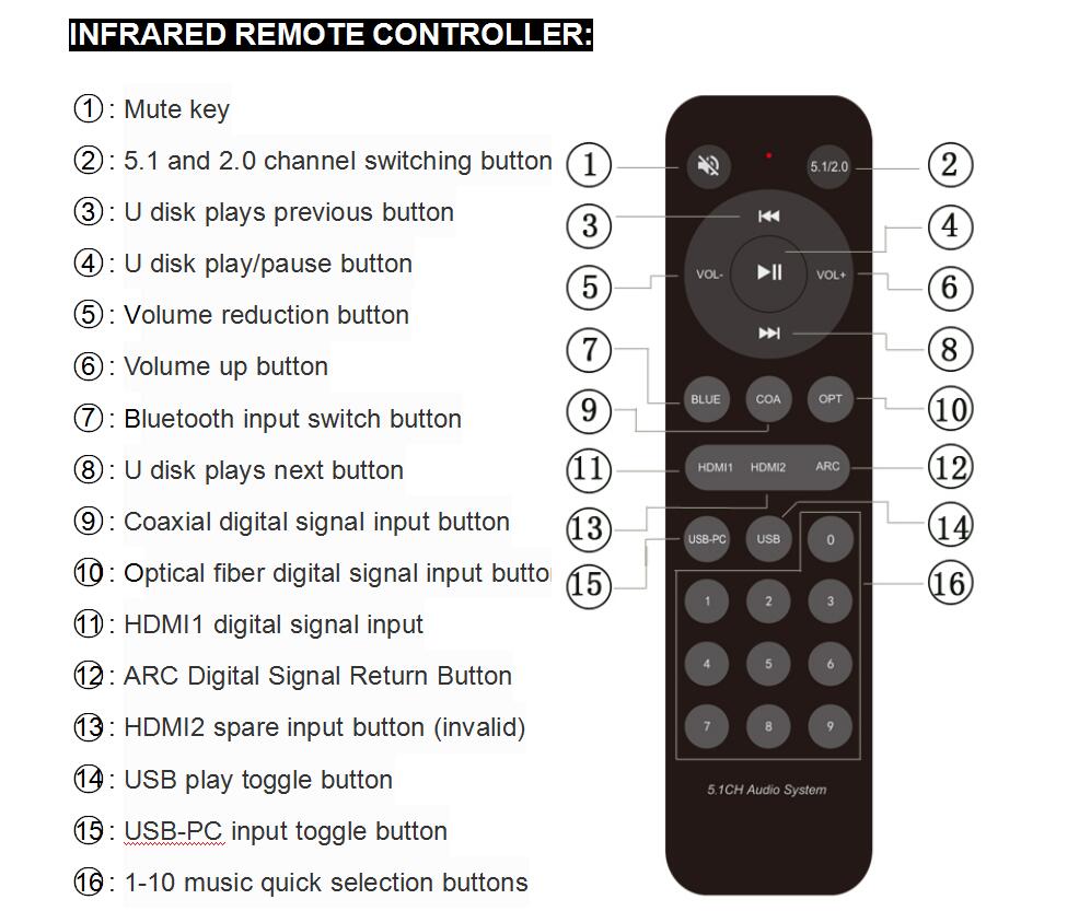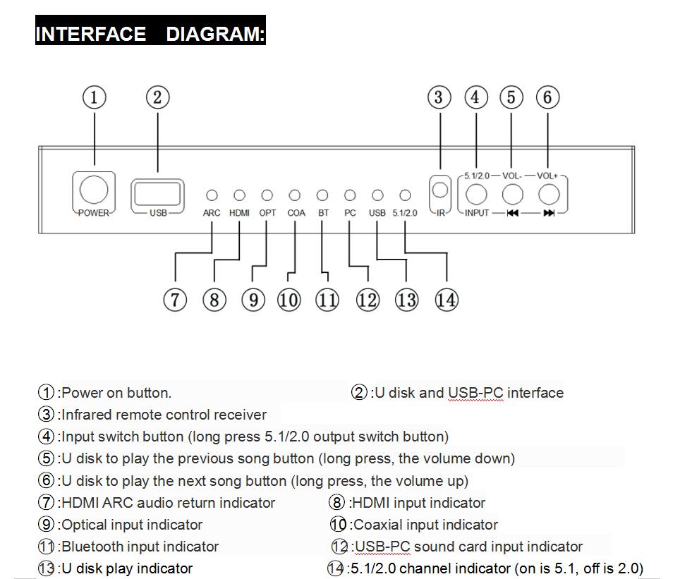 1. Supports one digital coaxial input, one digital optical fiber input, one HDMI inputs, one ARC audio return input, one Bluetooth 5.0 input, one way USB playback input and USB computer sound card input. Different signal sources can be switched freely.