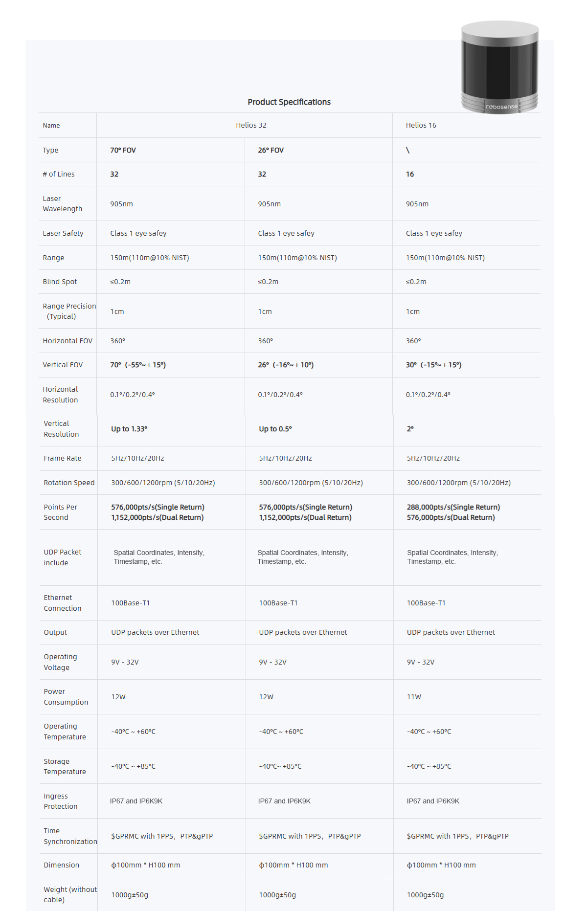 The 16-beam version, Helios 16, offers a 30° Vertical FoV and has been fully upgraded in both performance and functionality compared to the RS-LiDAR-16.