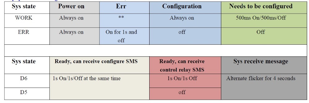 LED interface: There are 2 LED lights named work and err. LED indicators state corresponds to the equipment working conditions are as follows, each column is one state.