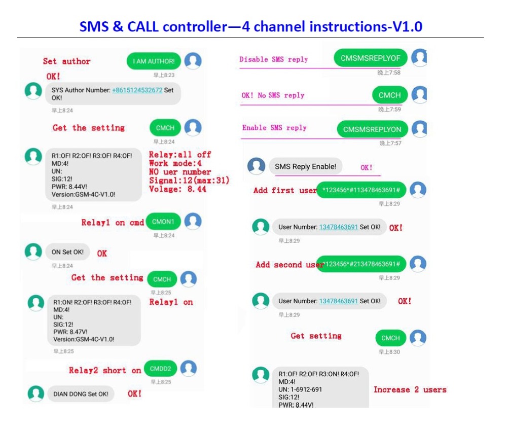 System status query instruction: CMCH. For example, sends the SMS: CMCH. Author and user can know the setting of the device. If you are the author, you will get the following information: status of relay, relay timer, work mode, three bit user number of in the later, signal of GSM module, the voltage of power, and the version of device; If you are the user, you will get the following information: status of relay, relay timer, work mode, and version of device.