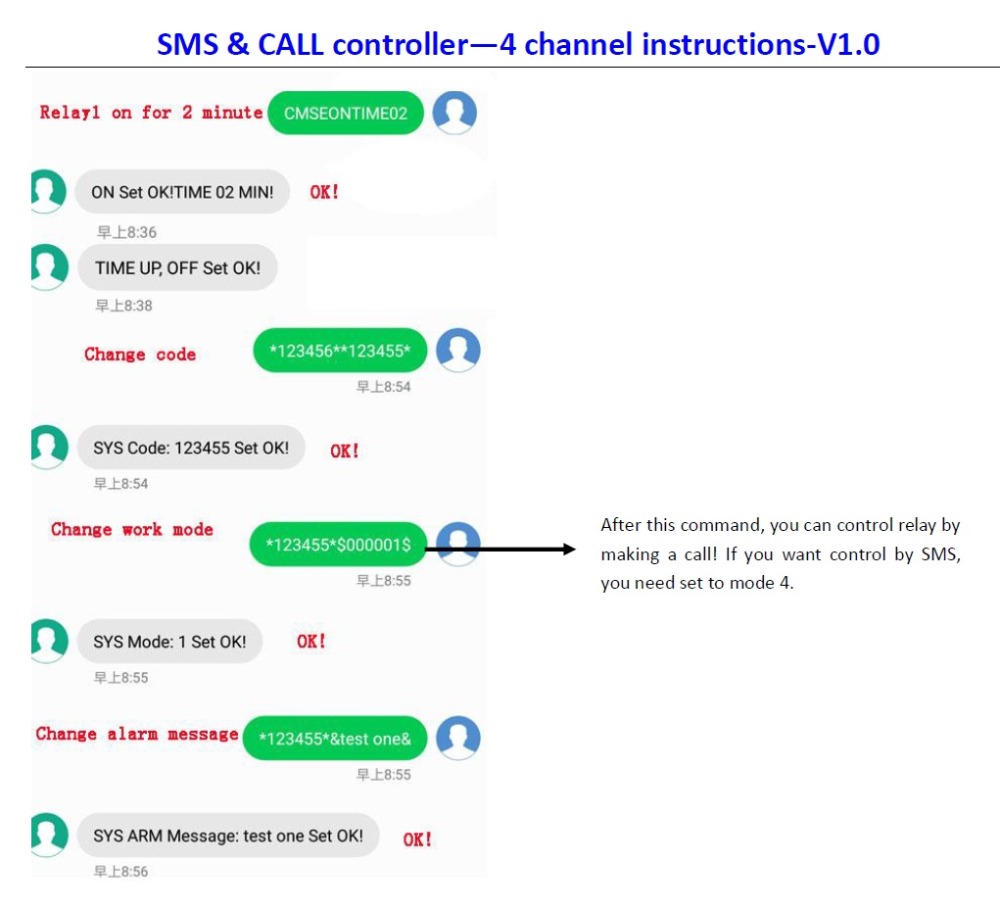 Mode configuration: Format: *code*$00000N $, N=1, 2, 3, 4. If you want to set system work at mode 1, send the SMS: *123456*$000001$. The device will reply SYS Mode: 1 Set OK! Note that only authorized number can change the code.