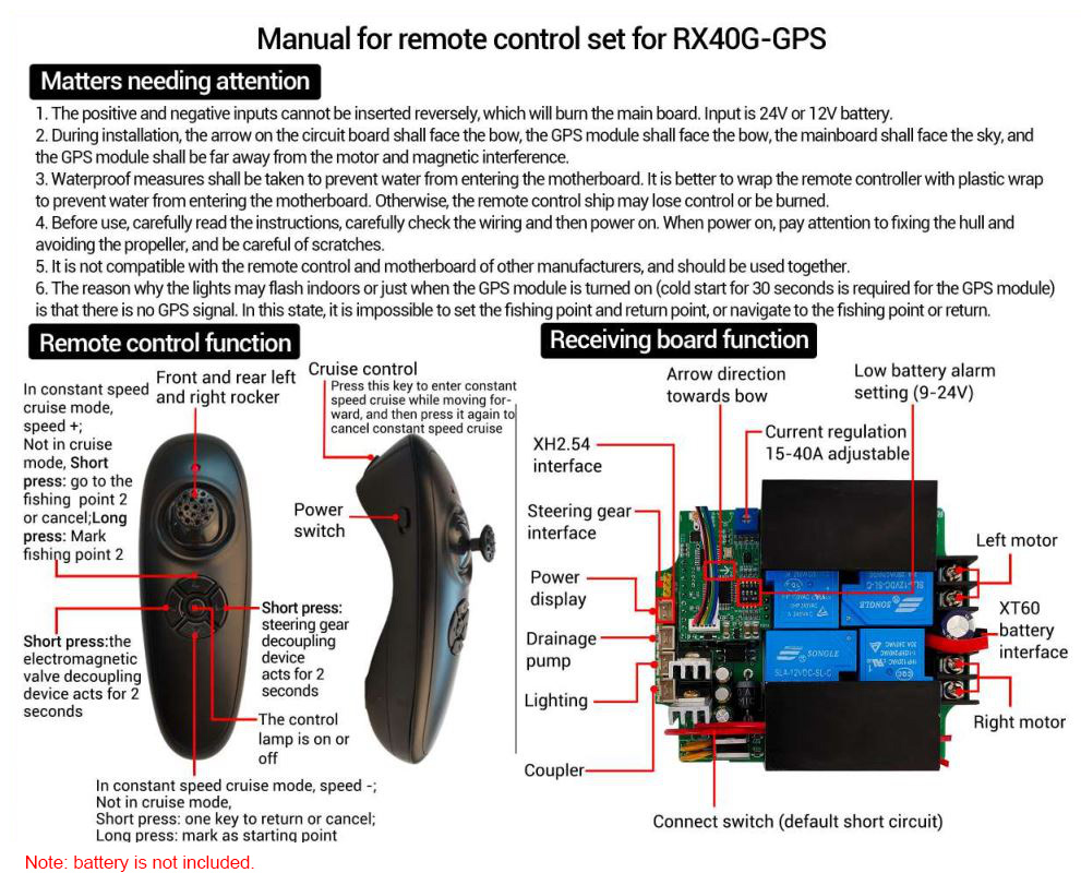- Boat motherboard with battery voltage low battery reminder, remote control battery low battery reminder, and weak signal reminder (when wireless signal exceeds the distance)