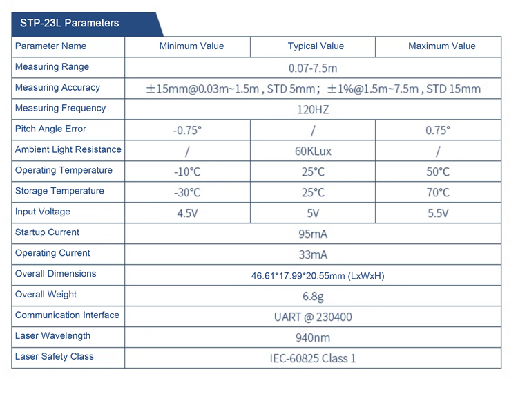 * The maximum measurement distance of STP-23L is up to 7.5m.