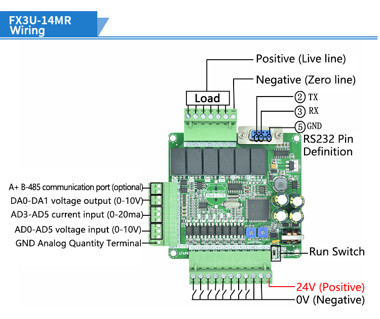 - Program steps: 8000 steps; 2 communication ports: 1 RS232 (standard 9-pin serial port FX3u protocol 38400, 7, E, 1), 1 RS485
