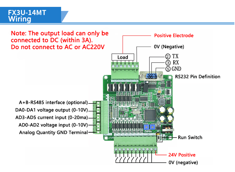 - Analog quantity input: 6 analog quantity inputs, 12-bit precision, AD0~AD2 are voltage inputs 0-10V. AD3~AD5 are 0-20MA current input; use RD3A instruction to read analog quantity