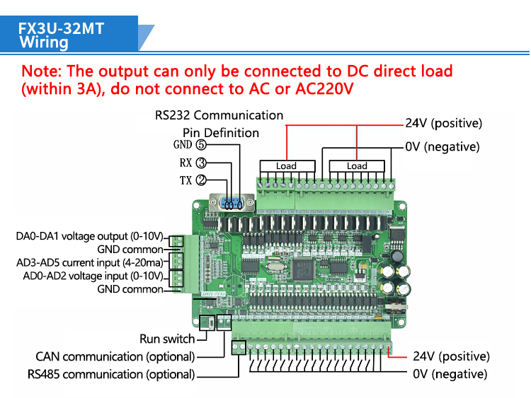 - Program steps: 8000 steps; 2 communication ports: 1 RS232 (standard 9-pin serial port FX3u protocol 38400, 7, E, 1), 1 RS485