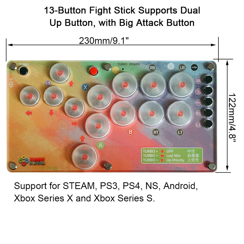 - 13-button game controller: Dual Up button can be set. With big attack button.
