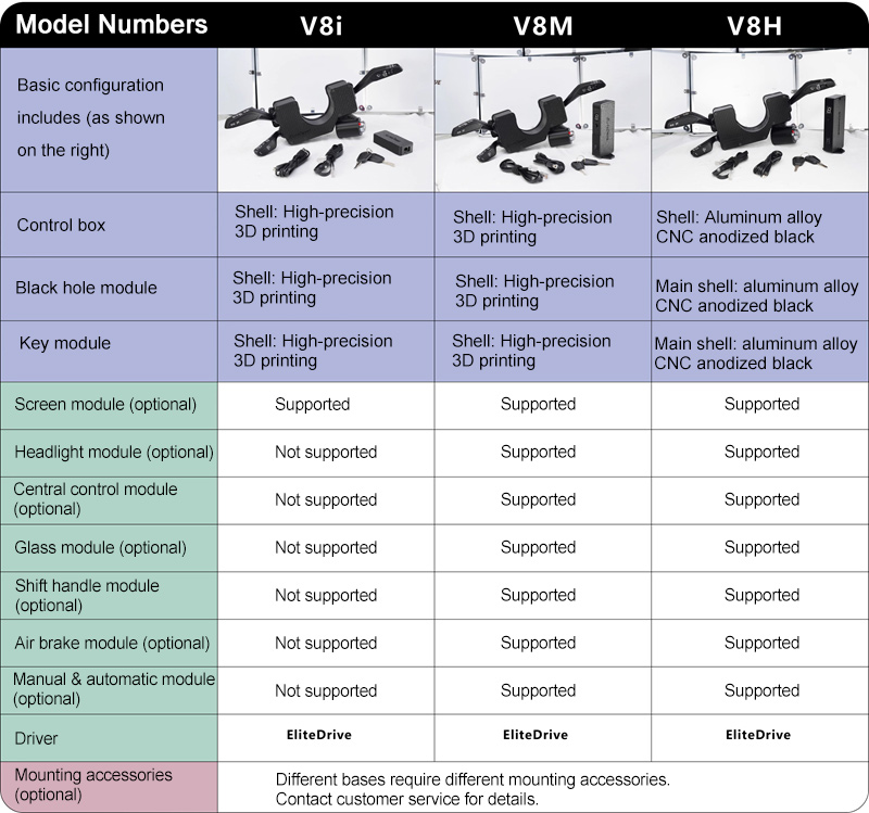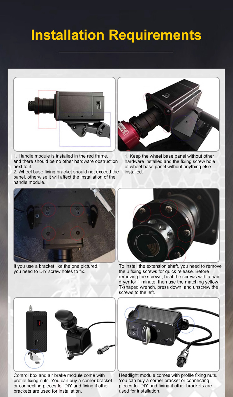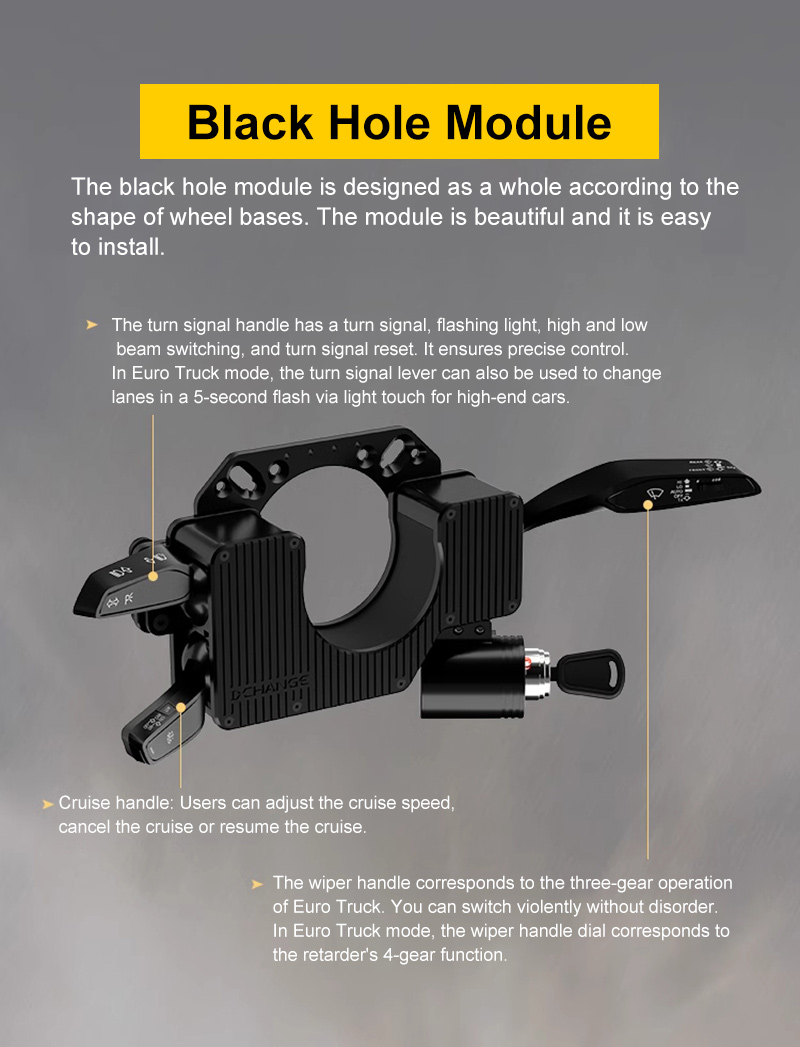 - Black hole module: The module is designed as a whole according to the shape of wheel bases. The module is beautiful and it is easy to install. The turn signal handle has a turn signal, flashing light, high and low beam switching, and turn signal reset. It ensures precise control. In Euro Truck mode, the turn signal lever can also be used to change lanes in a 5-second flash via light touch for high-end cars. Thanks to a cruise handle, users can adjust the cruise speed, cancel the cruise or resume the cruise. The wiper handle corresponds to the three-gear operation of Euro Truck. You can switch violently without disorder. In Euro Truck mode, the wiper handle dial corresponds to the retarder's 4-gear function.