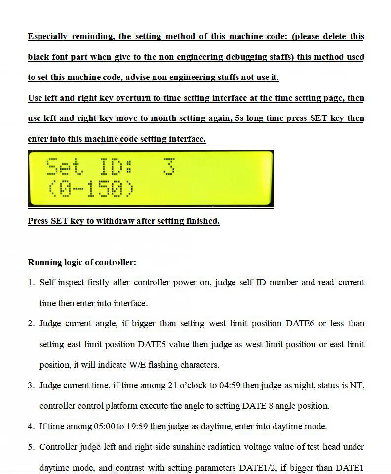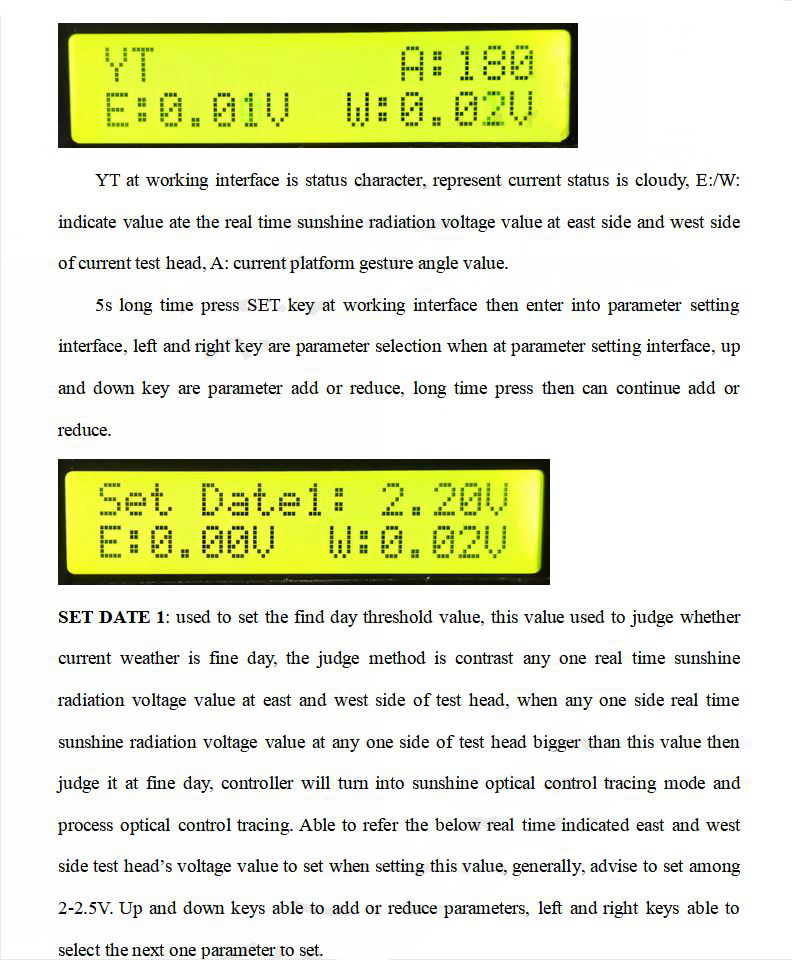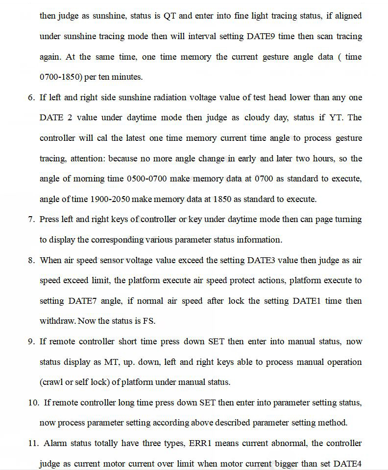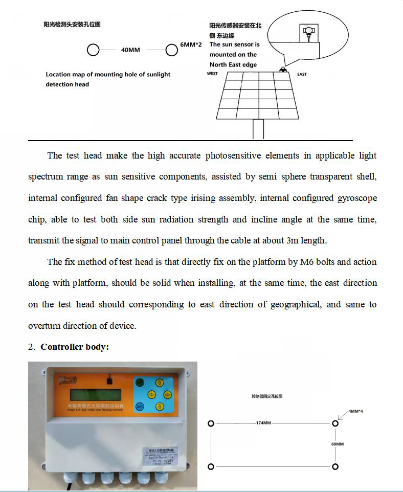1. The sun detection head has a built-in gyroscope chip, which can achieve dual-mode tracking. When it is sunny, it is controlled by precise light detection, and the angle is memorized every ten minutes. When it is cloudy, the angle memorized on the last day is automatically retrieved for attitude tracking.