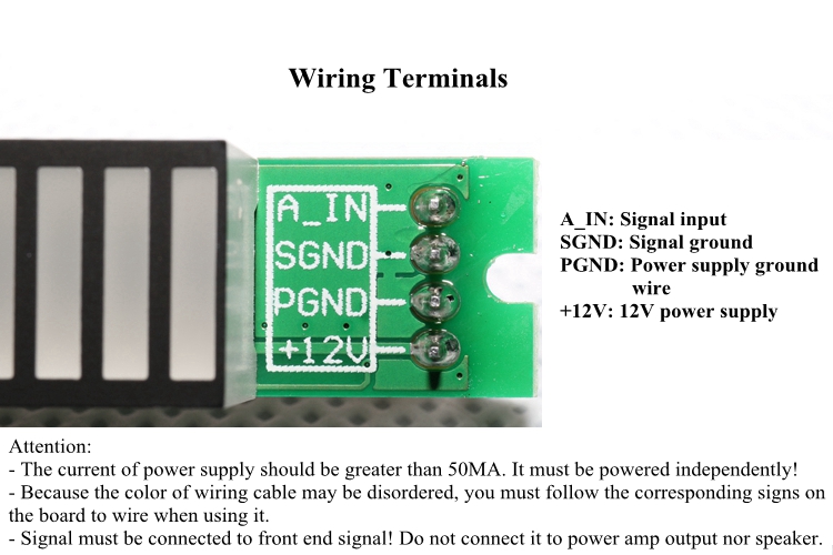 - Audio signal is taken from a 3.5mm conventional headphone jack, or connected in parallel with the input signal of audio device. Generally we call it a low-level signal, and the volume of audio device must be set to the maximum volume, and the low volume cannot be used. Can not be connected to a car speaker cable, can not be connected to the output end of power amplifier! Wrong connection will cause product damage! If there is no headphone jack nor other connectors, please purchase an adapter (cable) separately. It cannot be used in an environment with audio Bluetooth transmission. This product has only line input, and there is no voice control.