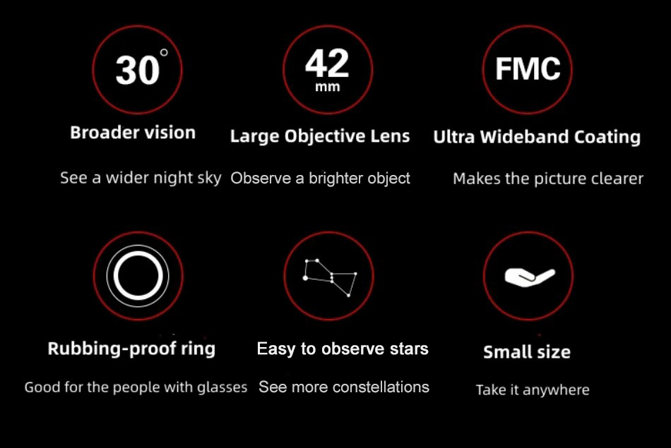 It has a 30-degree field of view, so that you can see a wider night sky.