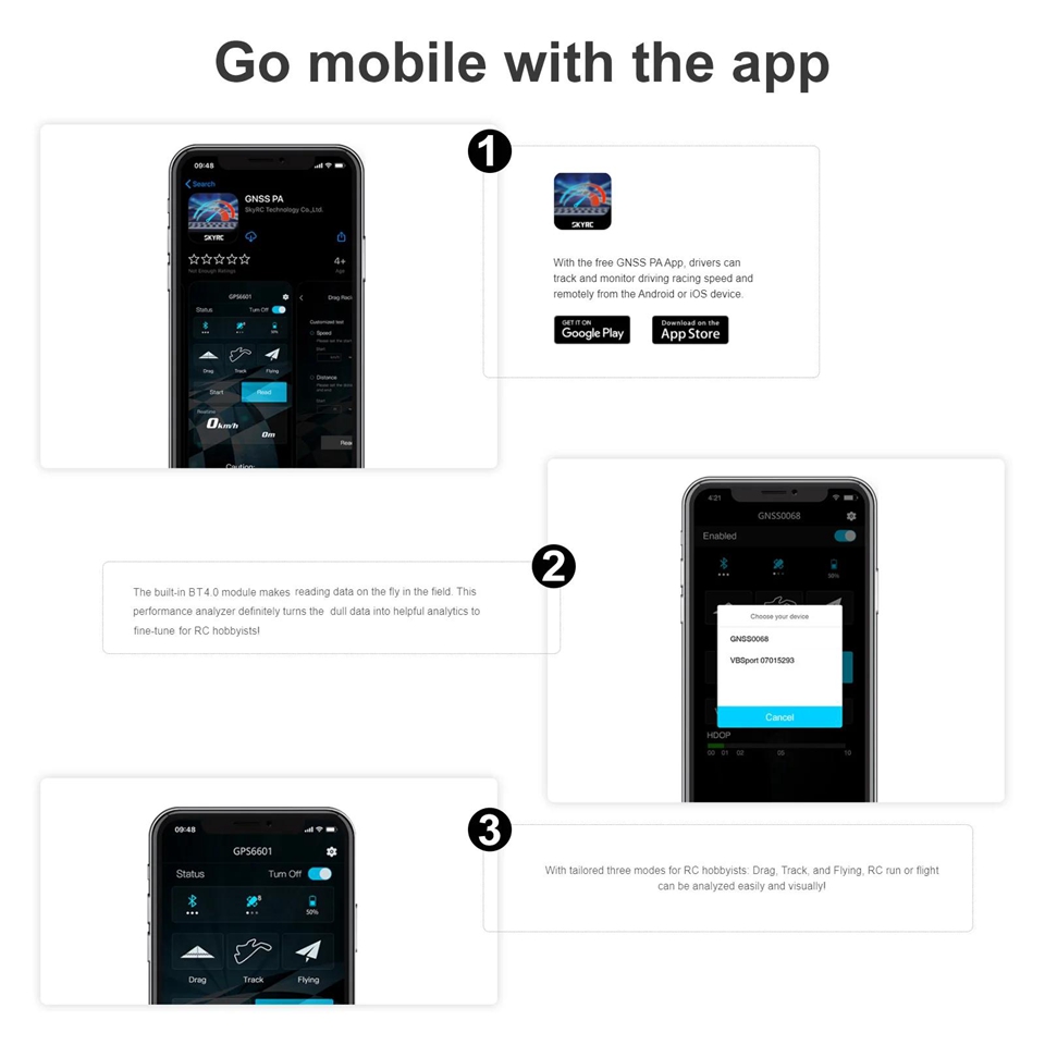 - With the free GNSS PA App, drivers can track and monitor driving racing speed and remotely for Android or IOS device. The built-in BT 4.0 module makes reading data on the fly in the field. This performance analyzer definitely turns the dull data into helpful analytics to fine-tune for RC hobbyists.