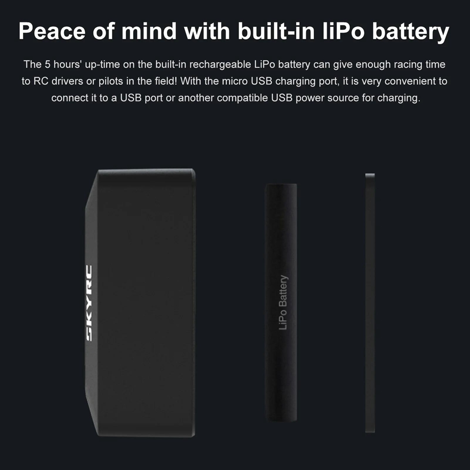 - The 5 hours' up-time on the built-in rechargeable LiPo battery can give enough racing time to RC drivers or pilots in the field! With the micro USB charging port, it is very convenient to connect it to a USB port or another compatible USB power source for charging. With Visual LED indicator, Data Share, Built-in 1M Memory, and Support both Metric and Imperial system of Measurement function.