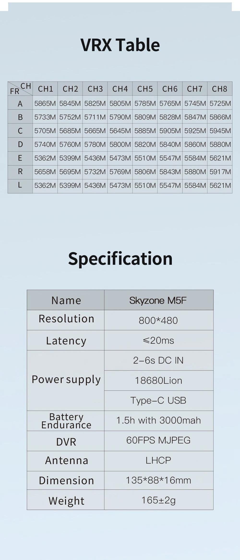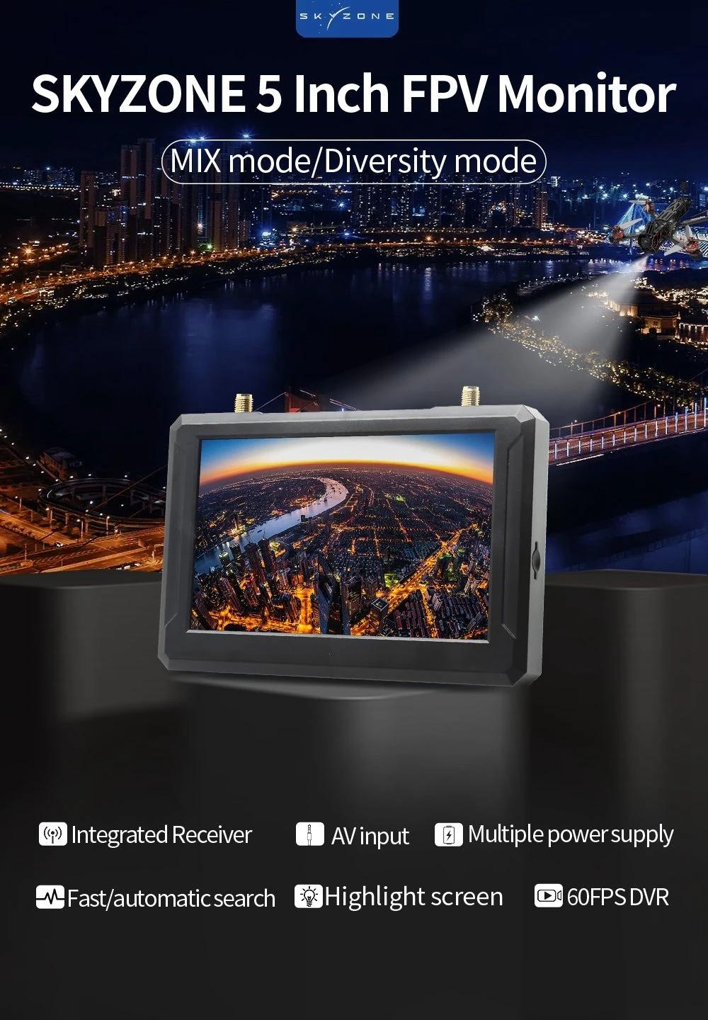 - The SKYZONE M5F 5.8 GHZ FPV monitor with DVR is the high brightness 5 inch monitor integrated with steady view receiver, the receiver merge two signals to one, avoid image tearing and rolling, make image more stable and clear. The wheel with classic skyzone UI made the goggles easy to use, the monitor support 1cell 18650 battery (not included), easy to switch battery, also support 2-6S Lipo, easy to power on the field.
