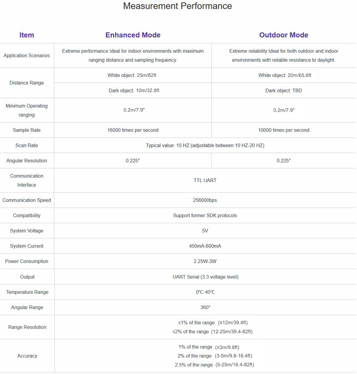- 25M/82FT Range Radius: With algorithm optimization, the ranging radius of RPLIDAR A3 has been increased to 25m/82ft, which means more environment outline information is to be collected.