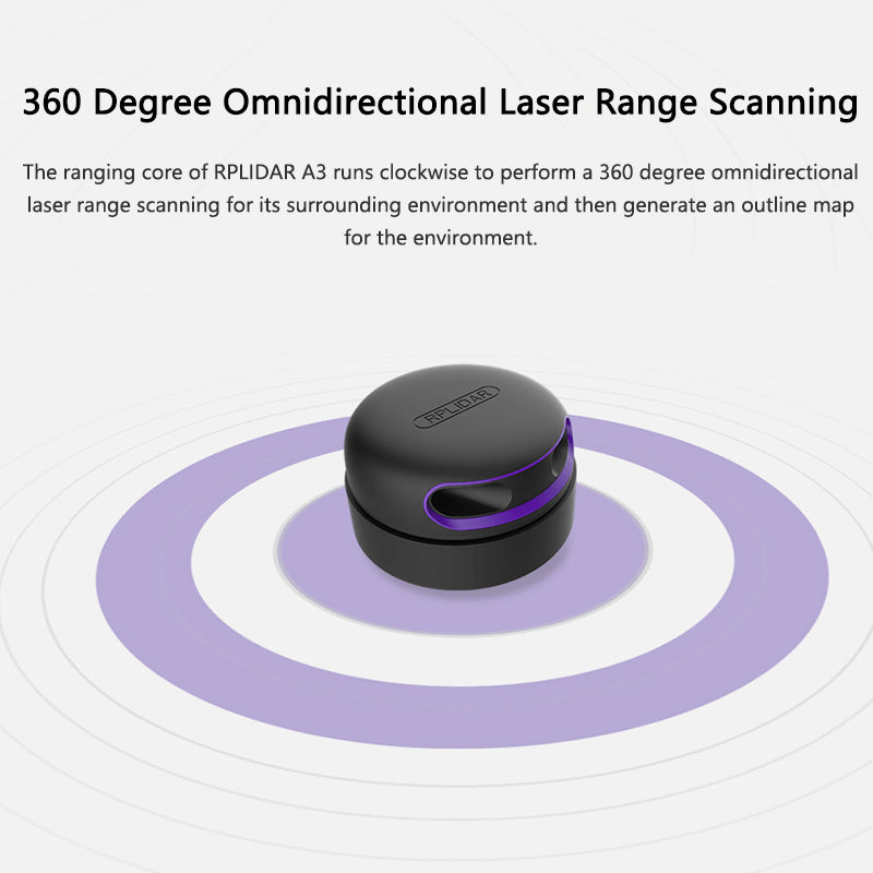 - 360 Degree Laser Range Scanning: The ranging core of RPLIDAR A3 runs clockwise to perform a 360 degree omnidirectional laser range scanning for its surrounding environment and then generate an outline map for the environment.