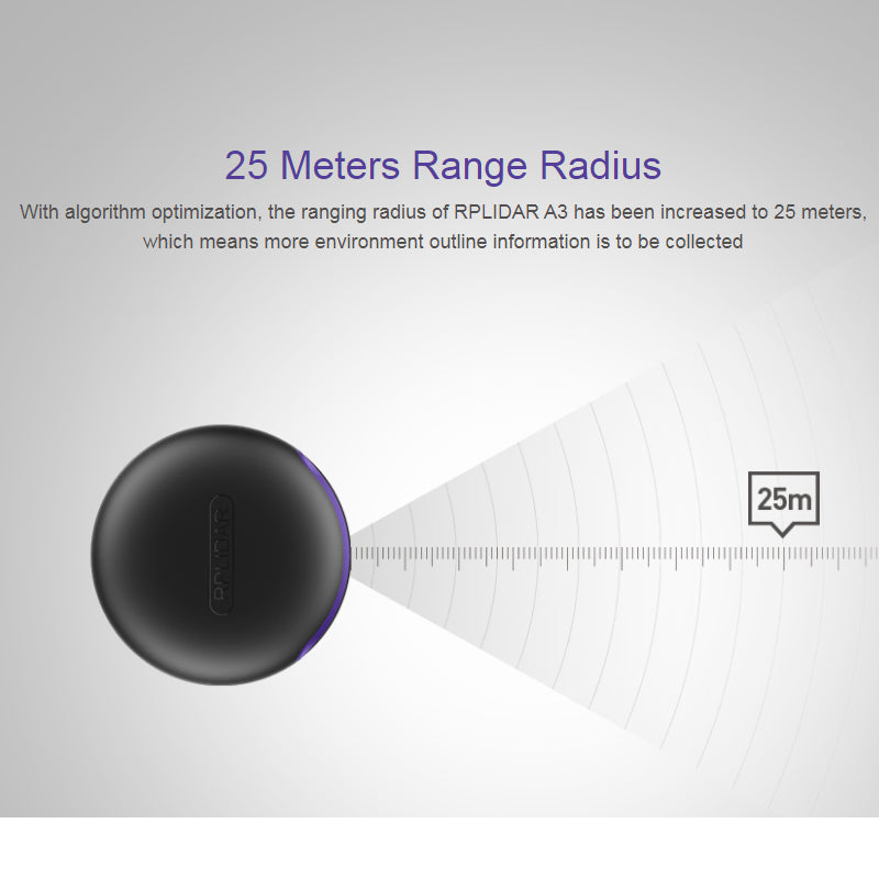 - 25M/82FT Range Radius: With algorithm optimization, the ranging radius of RPLIDAR A3 has been increased to 25m/82ft, which means more environment outline information is to be collected.