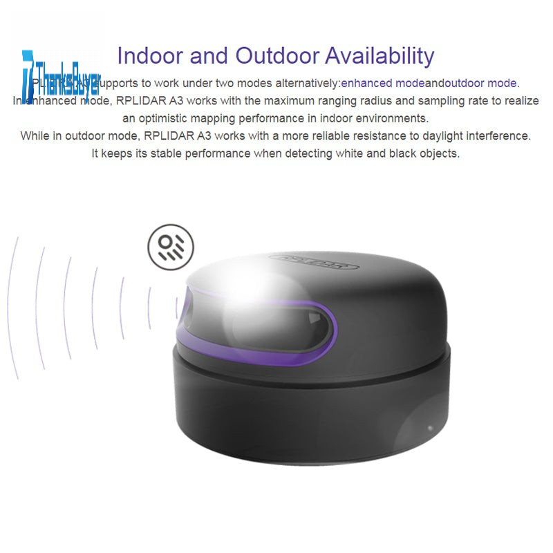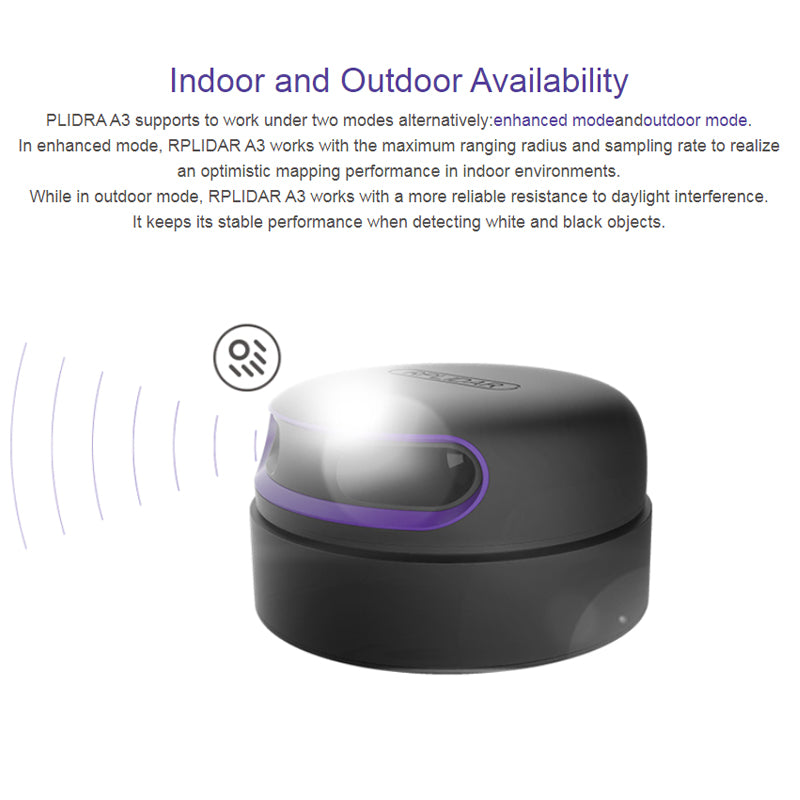 - Indoor and Outdoor Availability. PLIDRA A3 supports to work under two modes alternatively: enhanced mode and outdoor mode. In enhanced mode, RPLIDAR A3 works with the maximum ranging radius and sampling rate to realize an optimistic mapping performance in indoor environments. While in outdoor mode, RPLIDAR A3 works with a more reliable resistance to daylight interference. It keeps its stable performance when detecting white and black objects.