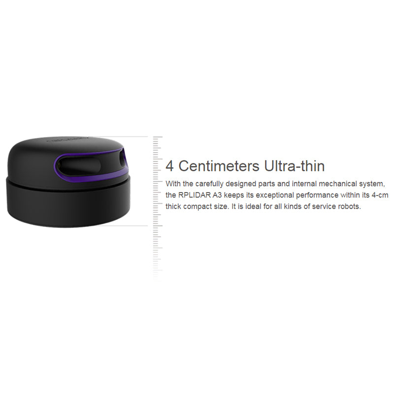 - 4cm/1.6" Ultra-thin: With the carefully designed parts and internal mechanical system, the RPLIDAR A3 keeps its exceptional performance within its 4cm/1.6" thick compact size. It is ideal for all kinds of service robots.