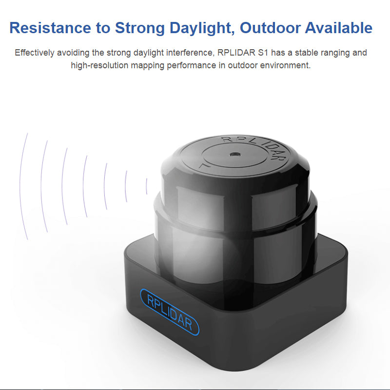 - Resistance to Strong Daylight, Outdoor Available: Effectively avoiding the strong daylight interference, RPLIDAR S1 has a stable ranging and high-resolution mapping performance in outdoor environment.