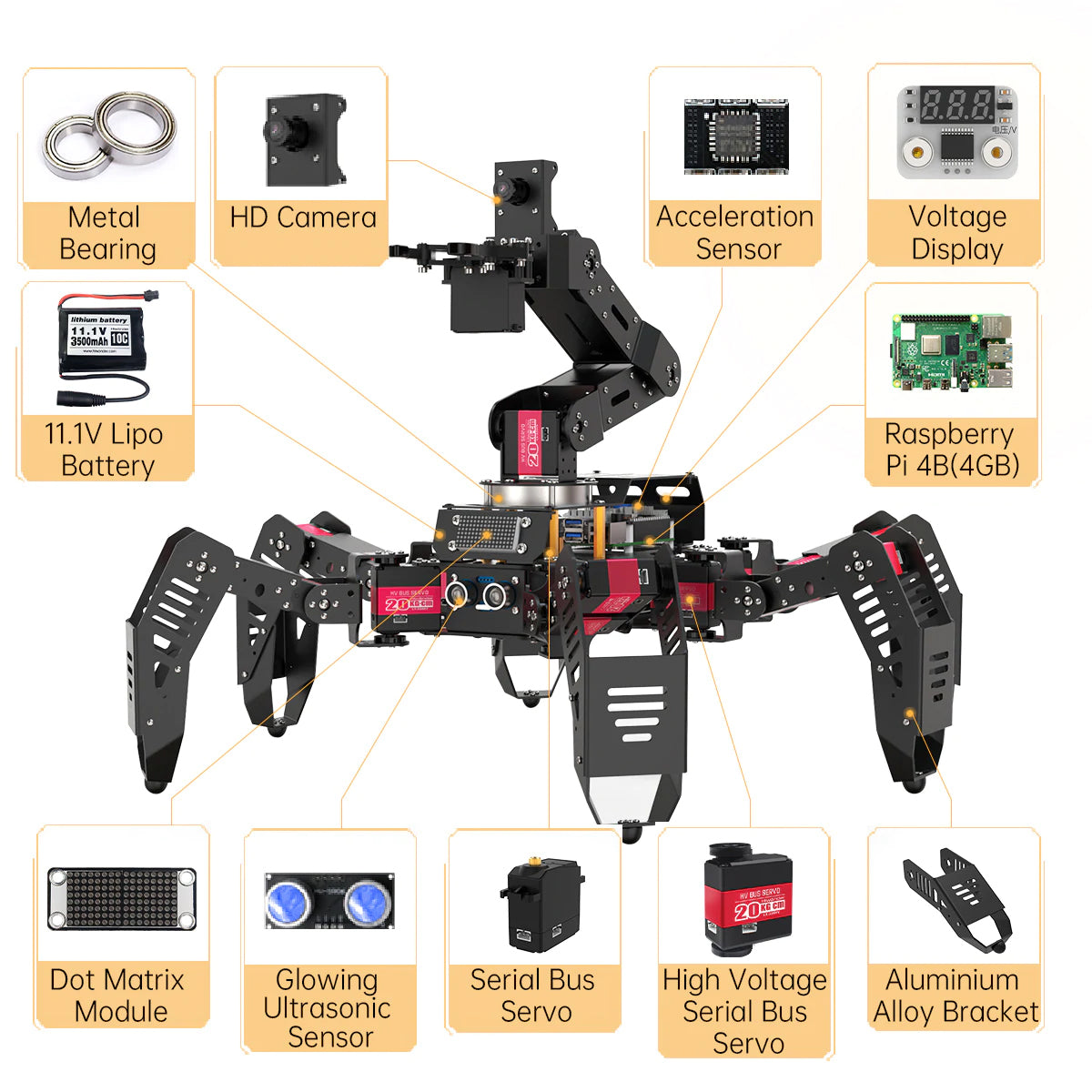 SpiderPi Pro Hexapod Robot Smart Robot w/ AI Robotic Arm Powered by Board for Raspberry Pi 4B 4GB