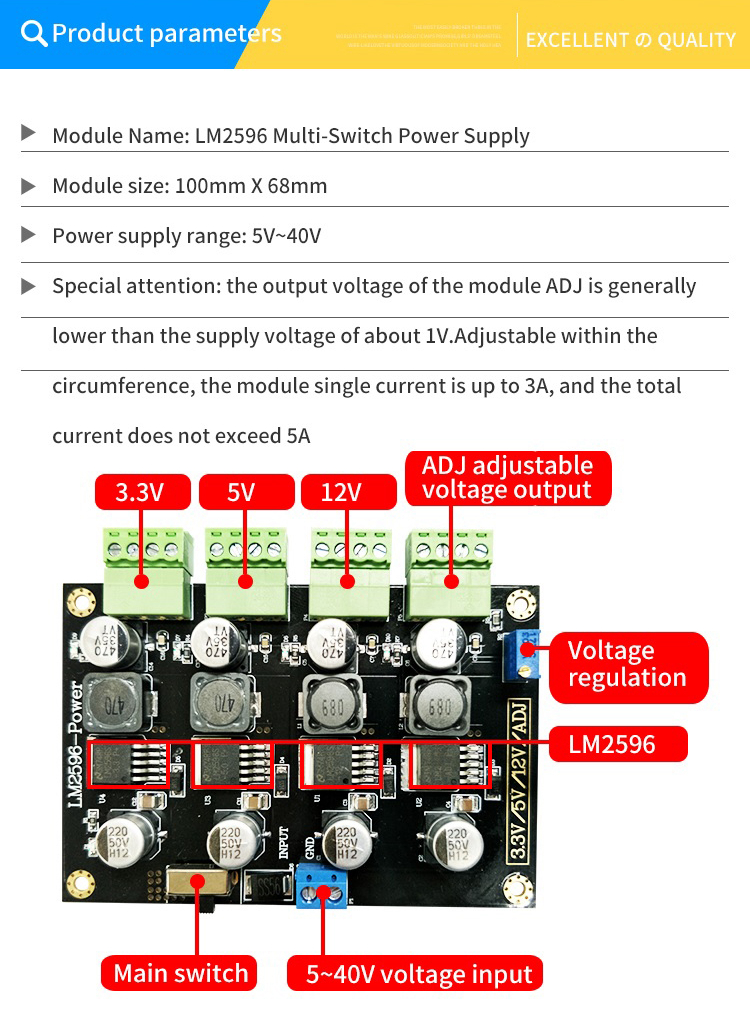 Switching Power Supply Board DC-DC Step-Down Power Supply Adjustable Module 3.3V/5V/12V Output LM2596