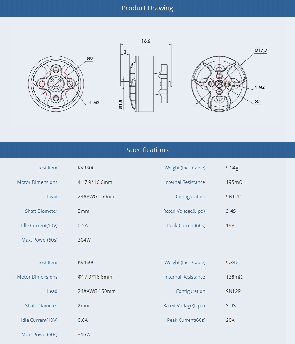 - Ultra light motor with strong power. Net weight 7.75g (without the weight of cable)