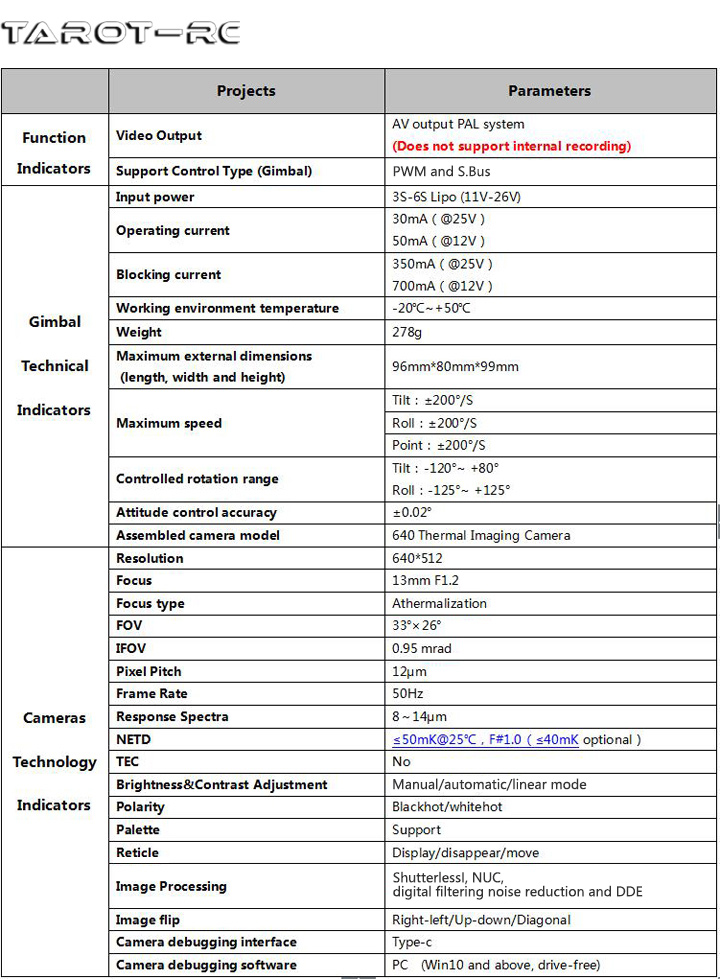 TL3T20 is a professional 3-axis thermal imaging gimbal camera by Tarot. With a built-in 640 thermal imaging movement, this gimbal can meet the needs of many industries such as power inspection and fire protection. It adopts a full CNC integral ribbed structure industrial design, and built-in independent IMU to accurately control the gimbal attitude. It integrates a servo drive module dedicated to gimbal. The gimbal camera supports pointing, following, and FPV first-view working modes. Equipped with a professional-grade 640 thermal imaging camera, it can be applied to fire fighting, forest public security, public security monitoring, search and rescue, environmental law enforcement, etc.