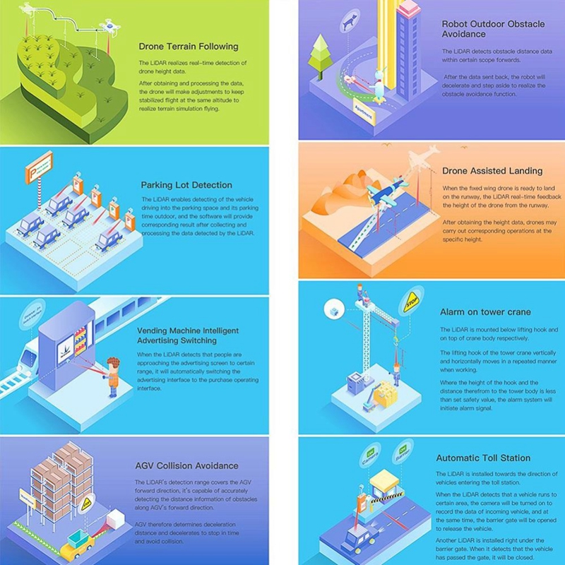 The TFMini micro LiDAR distance sensor for drones UAV UAS robots (12m) Laser Range Finder sensor has its unique optical, structural, and electronic designs, the product possesses 3 major advantages, low cost, tiny volume and low power consumption. It has built-in algorithm adapted to indoor and outdoor environments can guarantee an excellent ranging performance at a low cost and in a tiny volume, which highly expands the application fields and scenarios of LiDAR and lays a solid foundation for "future eyes" in the smart era.
