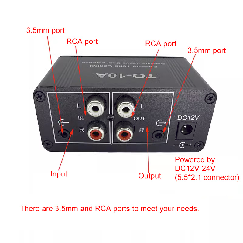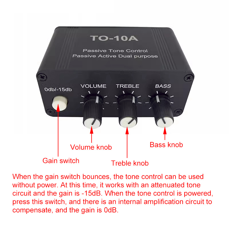 TO-10A adopts attenuation tone circuit and NE5532 preamplification compensation. When no power is available, its attenuation is -15dB. When the tone control is powered, the NE5532 operates to compensate for the gain of 0db, i.e. the input signal and output signal are equal.