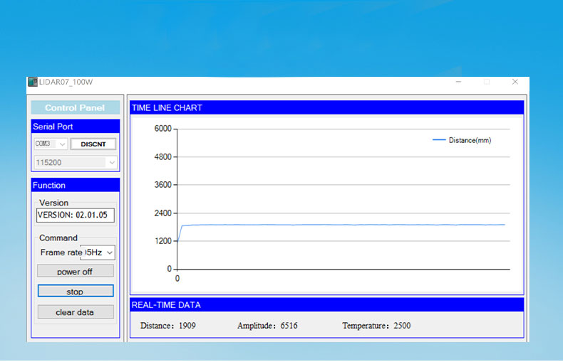 - Ranging frequency 5500HZ. Exposure time is 5us test frame rate. In actual application, the corresponding measurement time will be automatically adjusted inside the module, and data will be output only after the end of tests