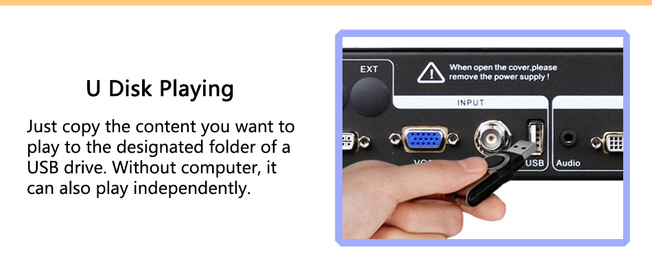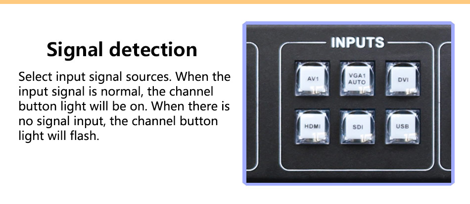 - 6-channel digital-analog video input: 1 HDMI-compatible, 1 DVI, 1 VGA, 1 AV and 1 USB. If you need to add SDI port, WIFI control and remote control, please contact us or you can search