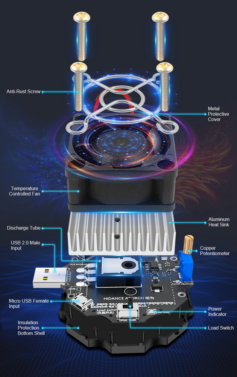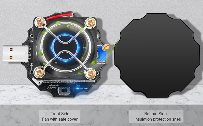 - Fan metal protection + bottom plate plastic shell protection. The bottom plate is protected by an open mold plastic shell, which is not easy to short-circuit and is beautiful. A metal protective cover is used on the cooling fan for safety protection, which brings the design technology of USB load to a higher level.