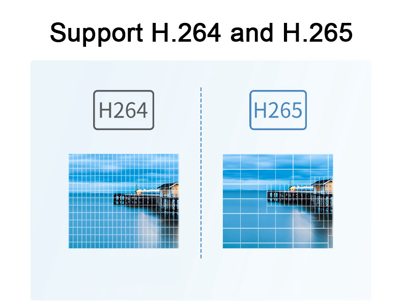 * Support H.264 and H.265 encoding: Using H.264/H.265 HD video compression technology, the efficiency of H.265 encoding is increased by 40% compared with that of H.264, bandwidth occupation is reduced by 50%, and image quality is clearer.