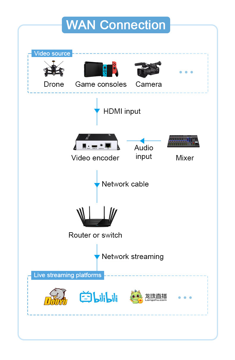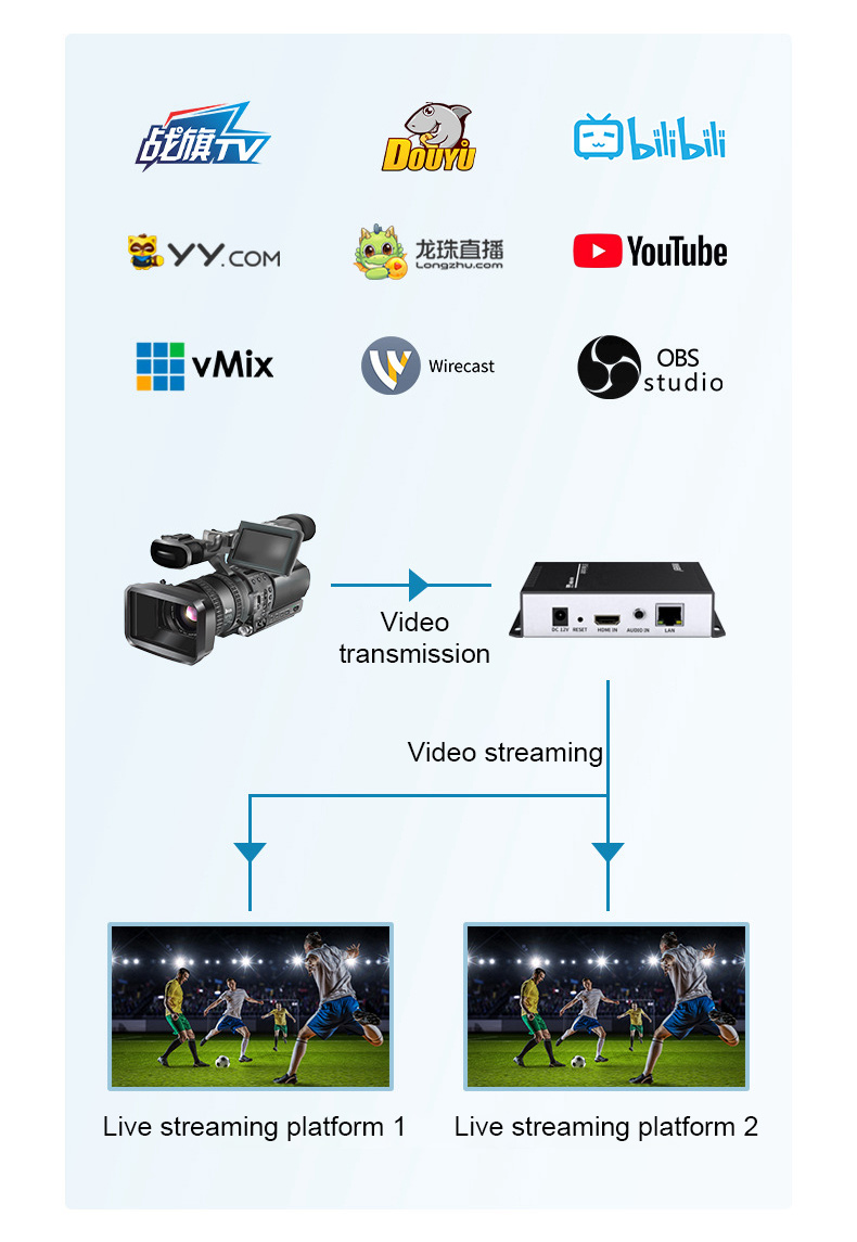 * Support multi-protocol and dual-stream live streaming: Support UTP/SRT/RTSP/RTMP/RTMPS/UDP/NVR and other protocol transmission. Compatible with major live streaming platforms. Supports dual streaming, which can push streams to two platforms at the same time for livestreaming.