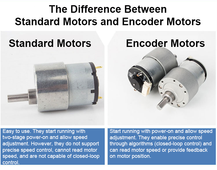* Encoder Motors: Start running with power-on and allow speed adjustment. They enable precise control through algorithms (closed-loop control) and can read motor speed or provide feedback on motor position.