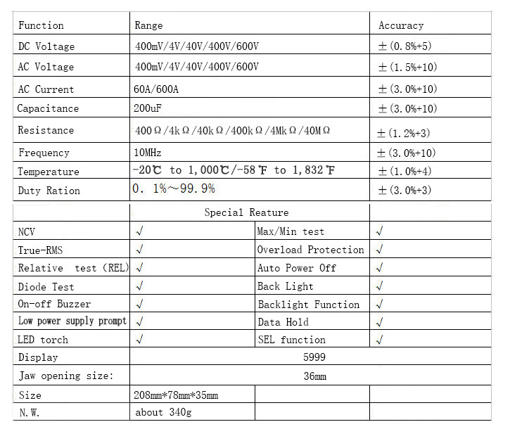 - DC/AC voltage test range: 400mV/4V/40V/400V/600V