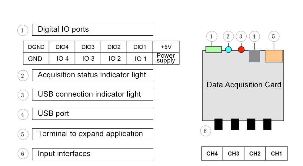 * 4 IO ports, configurable input and output, external trigger acquisition