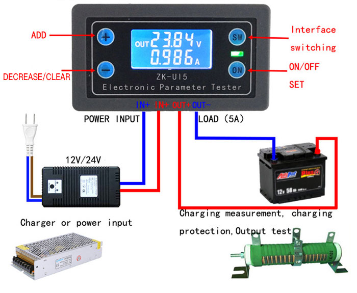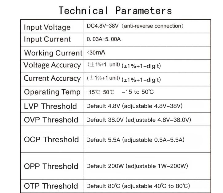 Voltmeter Ammeter Power Capacity Time Low-Voltage Over-Voltage Protections Charge Discharge Control