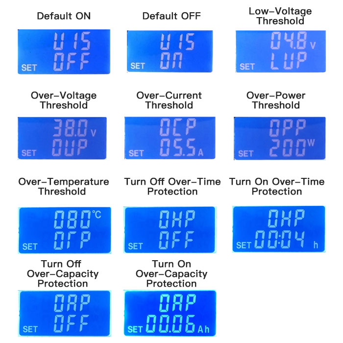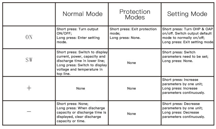 In setting interface, short press SW button to switch parameters to be set. Short press button + or - to adjust parameters. When over-time or overcapacity interface is displayed, press button ON shortly to select to turn on or off overtime protection or overcapacity protection. Their default state is off.