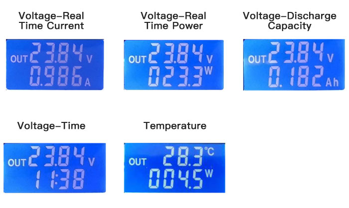 In normal mode, LCD displays input voltage and temperature in the first line. And displays real-time current, power, capacity and discharge time.